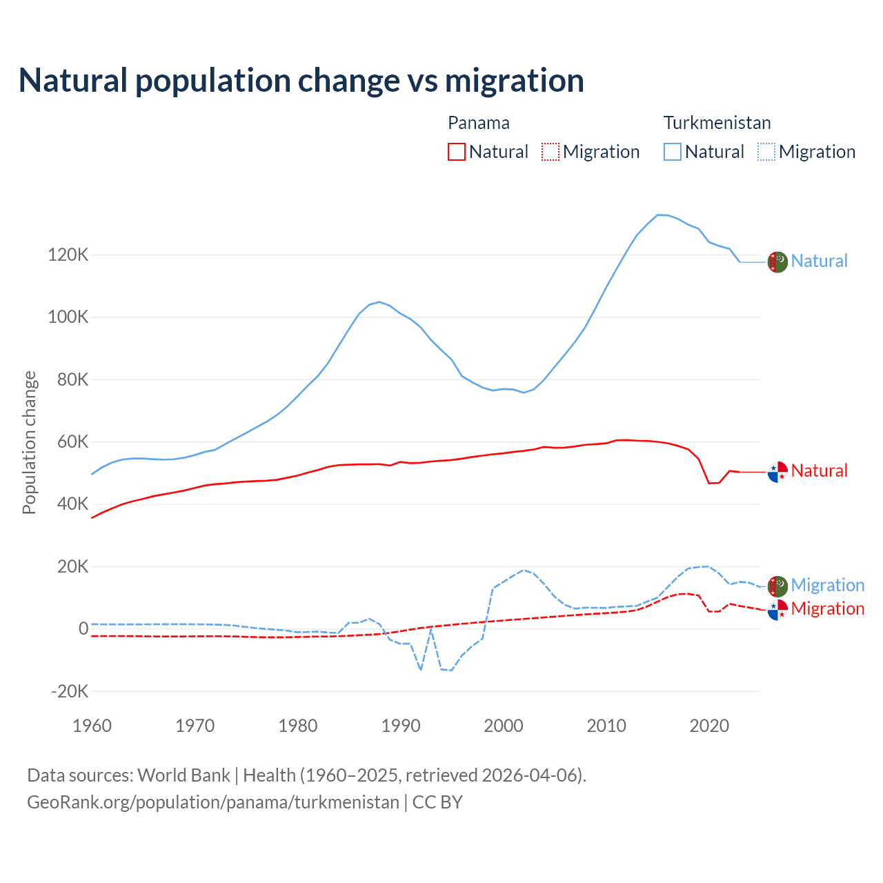 Over the last 10 years, 86.5% of the population change in Panama is from natural causes (a gain of 544,211 people) and 13.5% is from migration (a gain of 84,849 people). In Turkmenistan 89.2% is from natural causes (a gain of 1,270,228 people) and 10.8% is from migration (a gain of 154,379 people).
