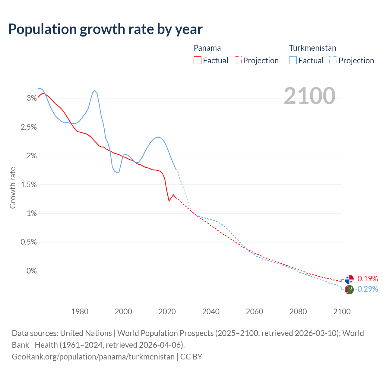 - For the last 10 years, Panama has had an average growth rate of +1.52% per year vs +2.14% in Turkmenistan.