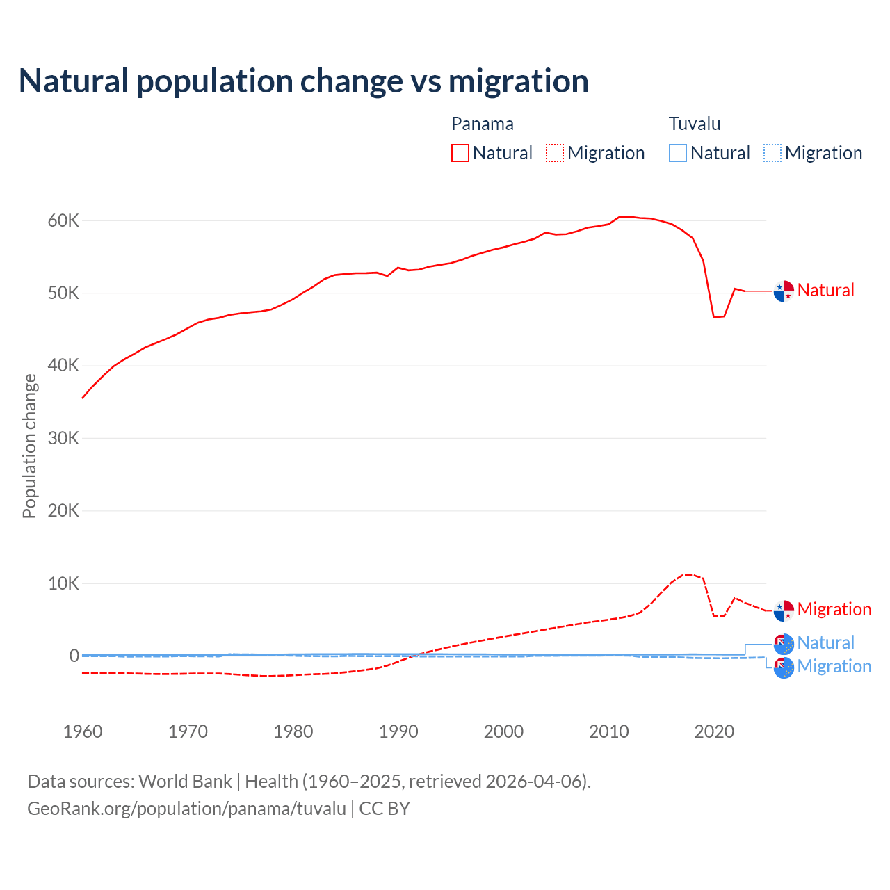 Over the last 10 years, 86.5% of the population change in Panama is from natural causes (a gain of 544,211 people) and 13.5% is from migration (a gain of 84,849 people). In Tuvalu 35.5% is from natural causes (a gain of 1,556 people) and 64.5% is from migration (a loss of 2,827 people).