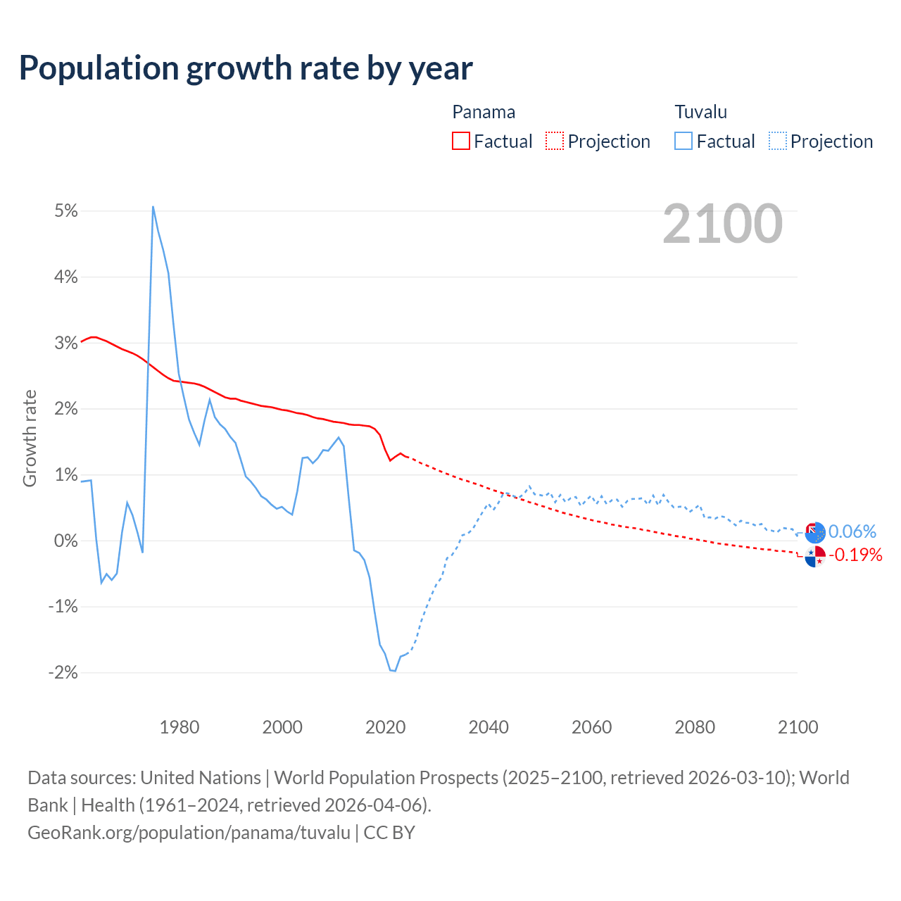 - For the last 10 years, Panama has had an average growth rate of +1.52% per year vs -1.19% in Tuvalu.