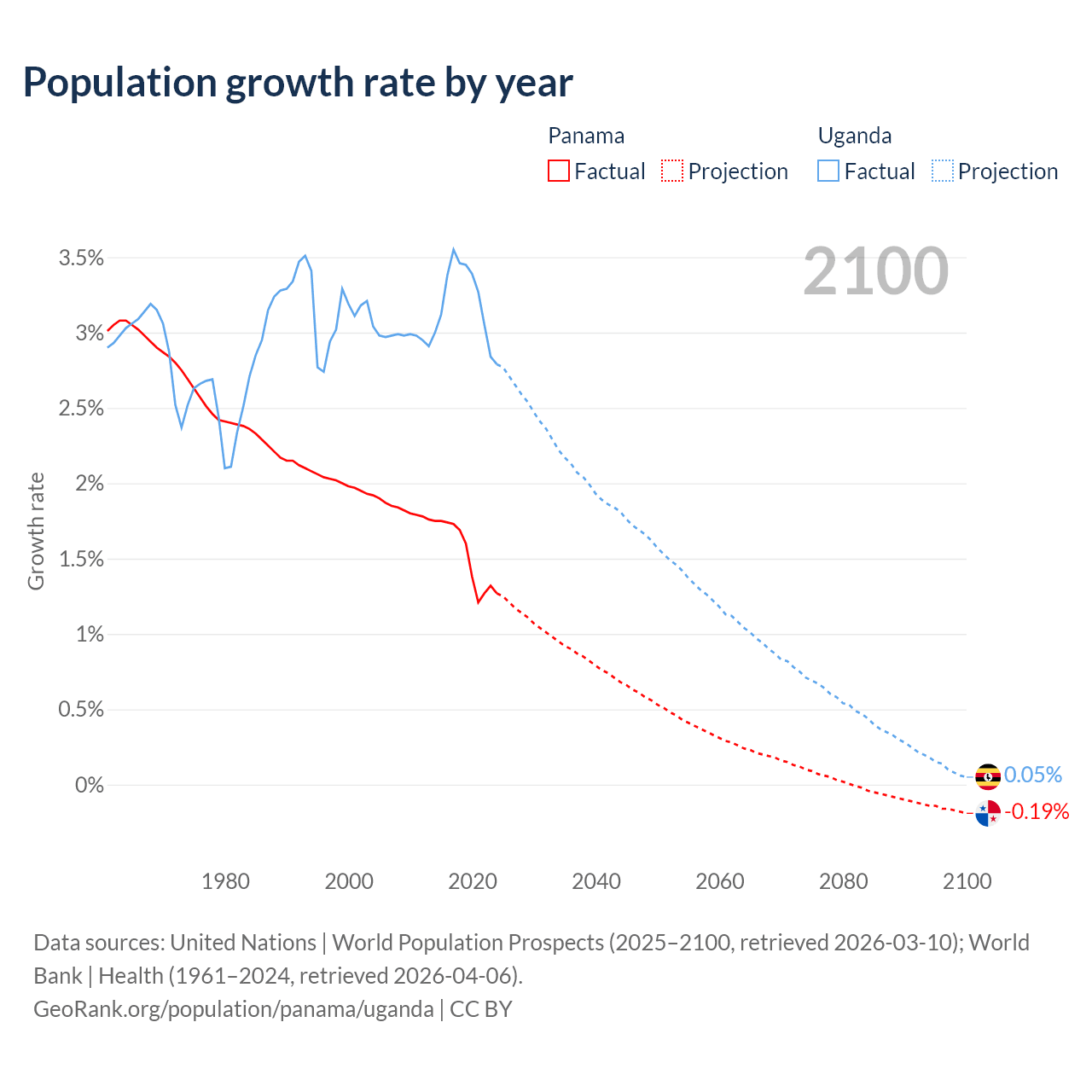 - For the last 10 years, Panama has had an average growth rate of +1.52% per year vs +3.21% in Uganda.