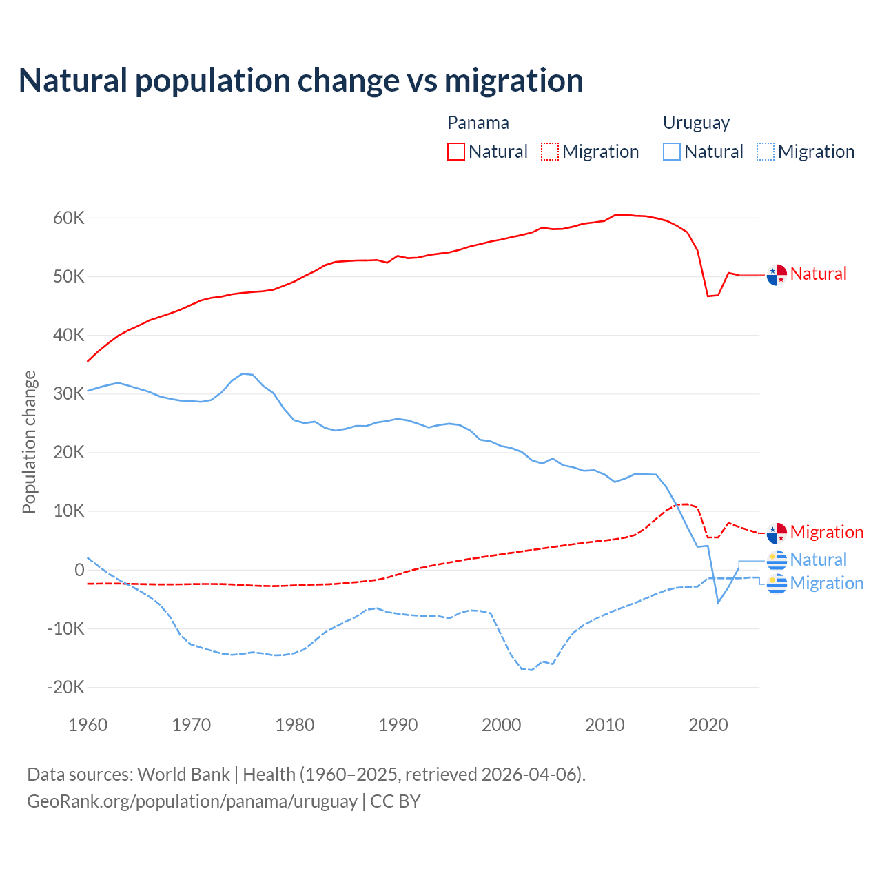 Over the last 10 years, 86.5% of the population change in Panama is from natural causes (a gain of 544,211 people) and 13.5% is from migration (a gain of 84,849 people). In Uruguay 70% is from natural causes (a gain of 64,303 people) and 30% is from migration (a loss of 27,501 people).