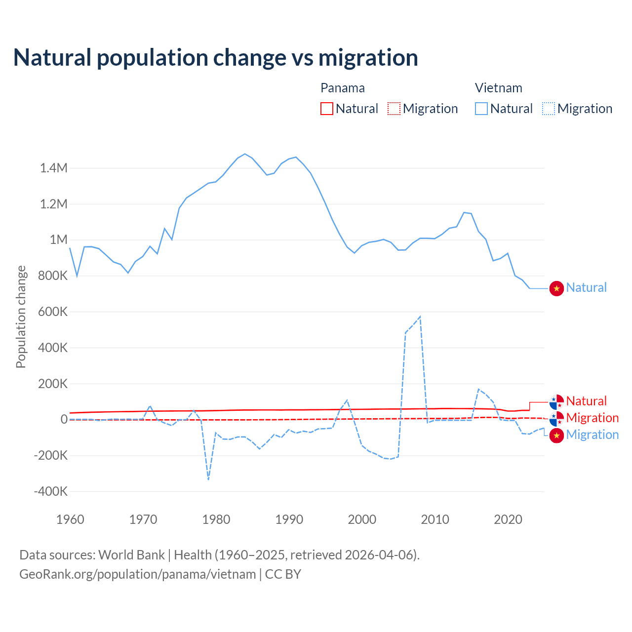 Over the last 10 years, 86.5% of the population change in Panama is from natural causes (a gain of 544,211 people) and 13.5% is from migration (a gain of 84,849 people). In Vietnam 97.7% is from natural causes (a gain of 9,349,756 people) and 2.29% is from migration (a gain of 219,073 people).