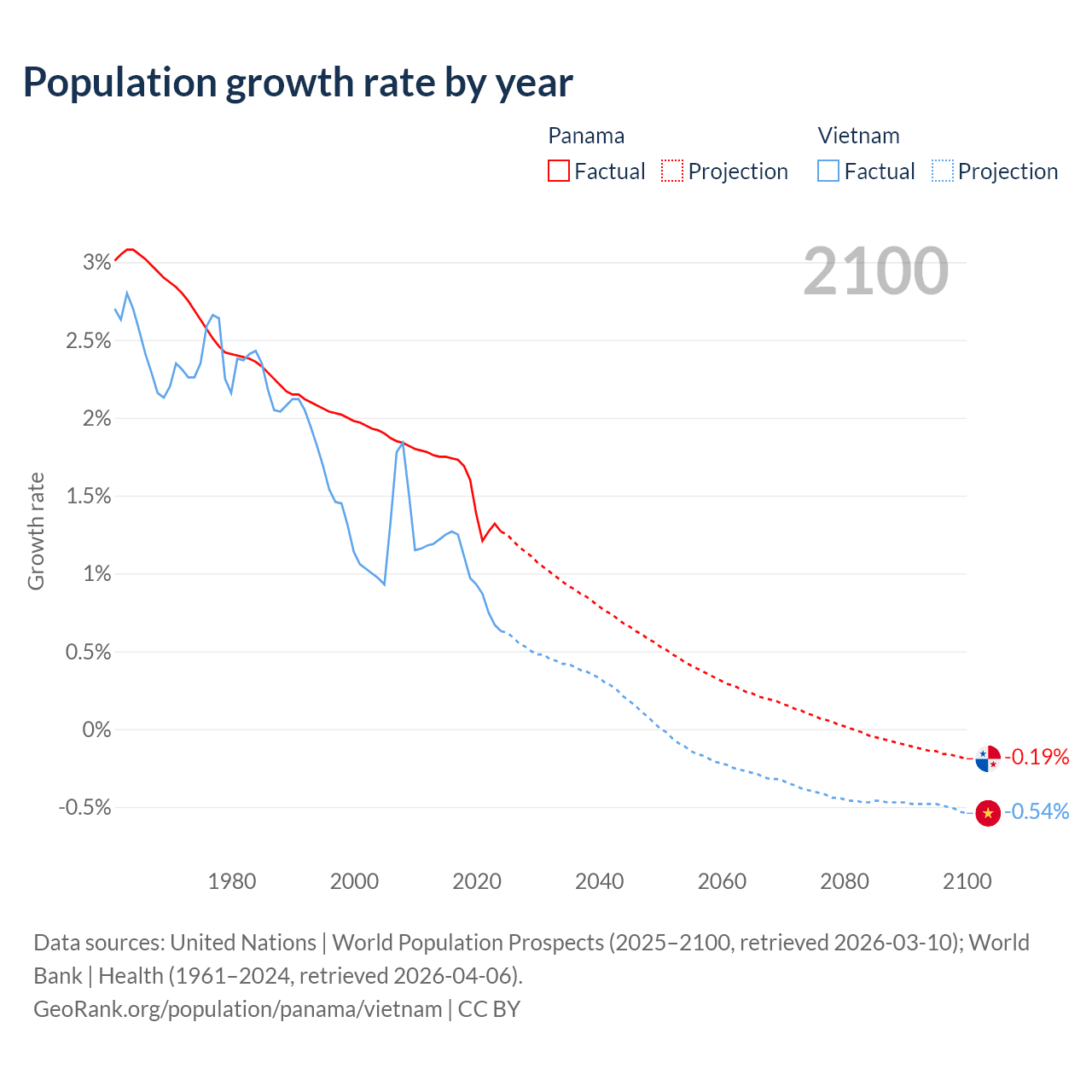 Data sources: World Bank | Health (1960–2024, retrieved 2026-04-06); United Nations | World Population Prospects (1960–2026, retrieved 2026-03-10); U.S. Census Bureau (1960–2025, retrieved 2026-02-08); Central Intelligence Agency (CIA) (2000–2019, retrieved 2026-02-20).
