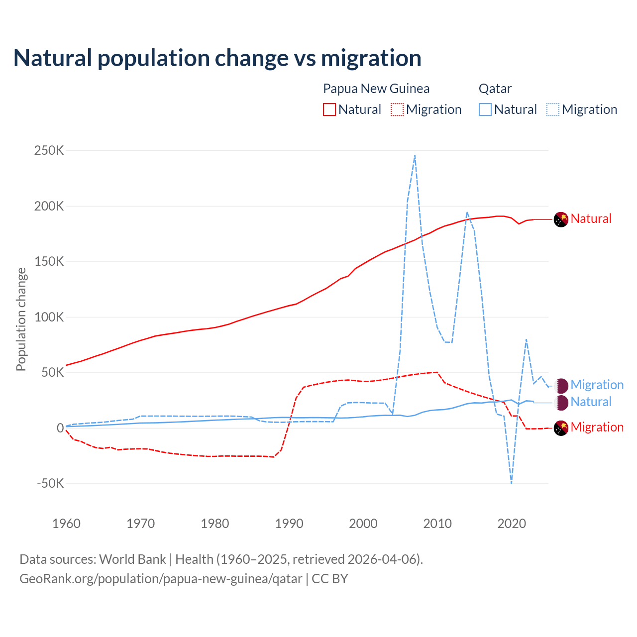 Over the last 10 years, 91% of the population change in Papua New Guinea is from natural causes (a gain of 1,883,906 people) and 8.98% is from migration (a gain of 185,900 people). In Qatar 26.1% is from natural causes (a gain of 232,009 people) and 73.9% is from migration (a gain of 655,712 people).