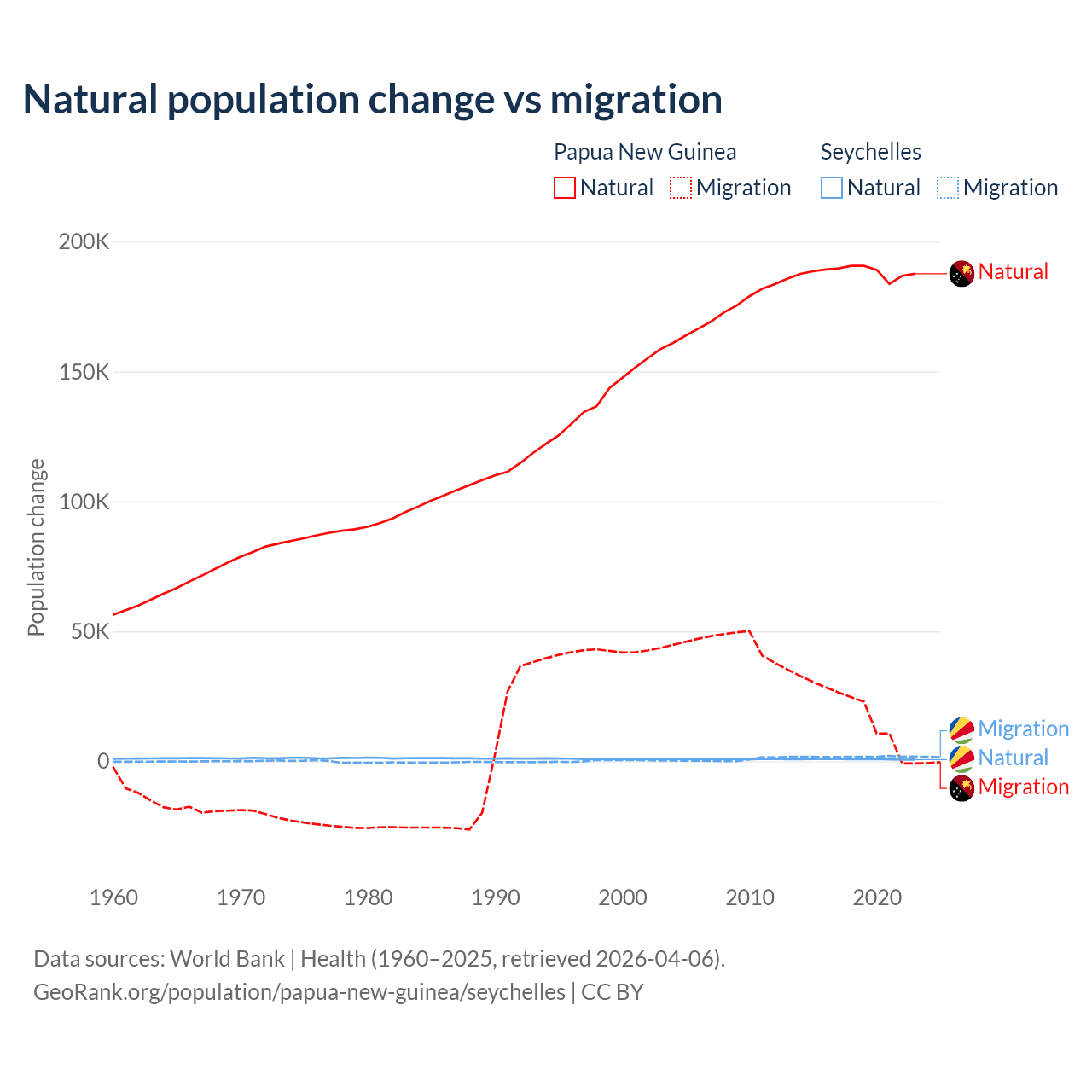 Over the last 10 years, 91% of the population change in Papua New Guinea is from natural causes (a gain of 1,883,906 people) and 8.98% is from migration (a gain of 185,900 people). In the Seychelles 31.4% is from natural causes (a gain of 8,122 people) and 68.6% is from migration (a gain of 17,748 people).