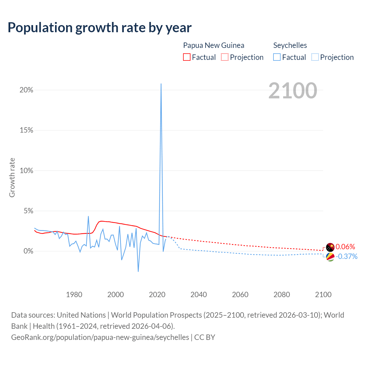- For the last 10 years, Papua New Guinea has had an average growth rate of +2.23% per year vs +2.9% in the Seychelles.