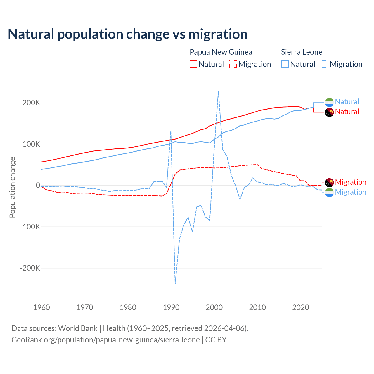 Over the last 10 years, 91% of the population change in Papua New Guinea is from natural causes (a gain of 1,883,906 people) and 8.98% is from migration (a gain of 185,900 people). In Sierra Leone 99.6% is from natural causes (a gain of 1,764,049 people) and 0.41% is from migration (a loss of 7,211 people).