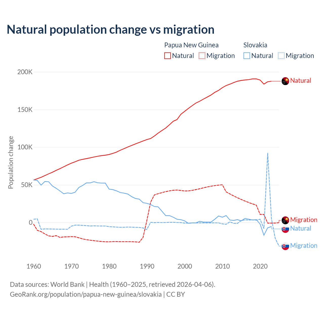 Over the last 10 years, 91% of the population change in Papua New Guinea is from natural causes (a gain of 1,883,906 people) and 8.98% is from migration (a gain of 185,900 people). In Slovakia 7.47% is from natural causes (a loss of 8,728 people) and 92.5% is from migration (a gain of 108,156 people).