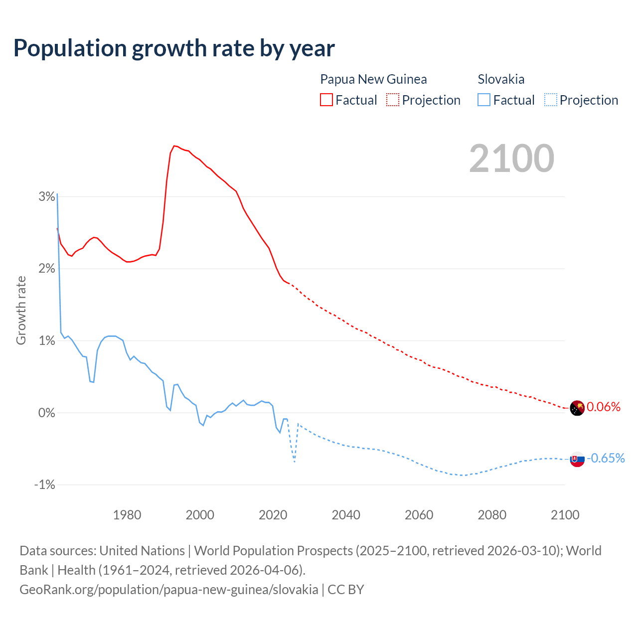 - For the last 10 years, Papua New Guinea has had an average growth rate of +2.23% per year vs +0.01% in Slovakia.