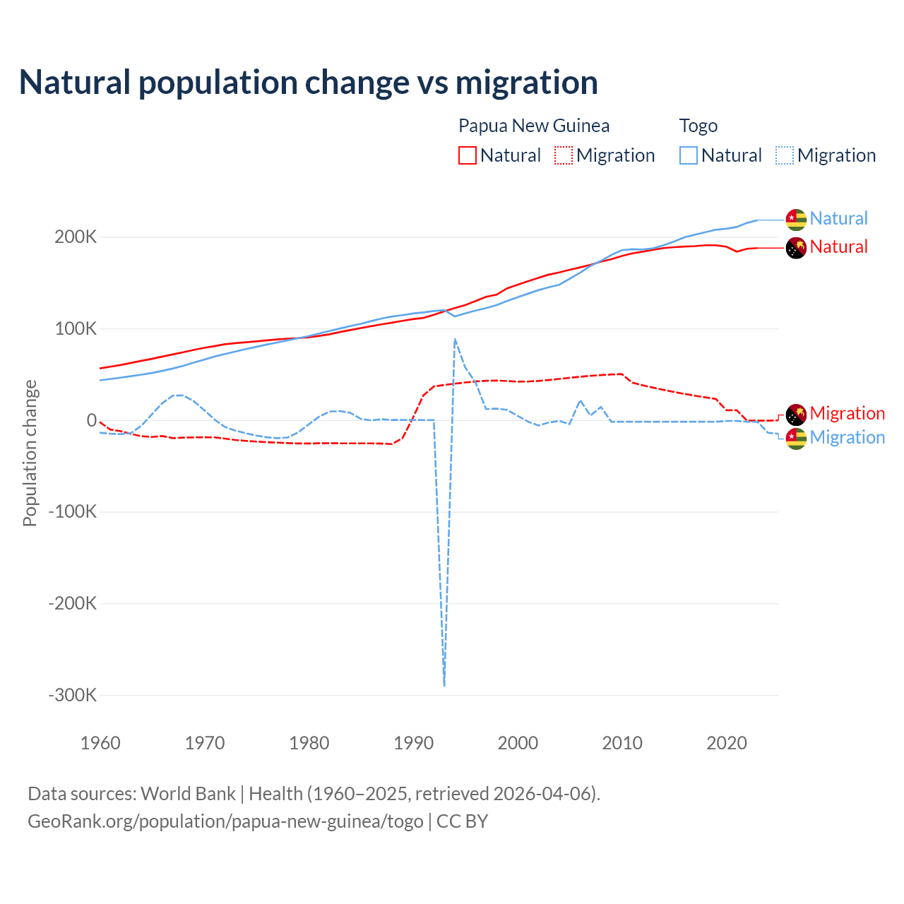 Over the last 10 years, 91% of the population change in Papua New Guinea is from natural causes (a gain of 1,883,906 people) and 8.98% is from migration (a gain of 185,900 people). In Togo 99.1% is from natural causes (a gain of 2,052,115 people) and 0.86% is from migration (a loss of 17,852 people).