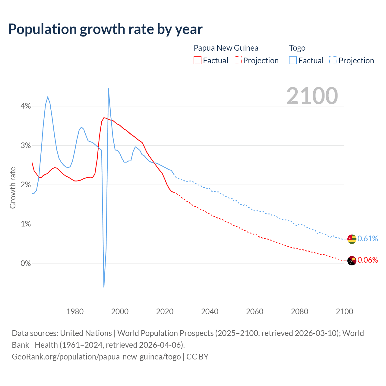 - For the last 10 years, Papua New Guinea has had an average growth rate of +2.23% per year vs +2.46% in Togo.
