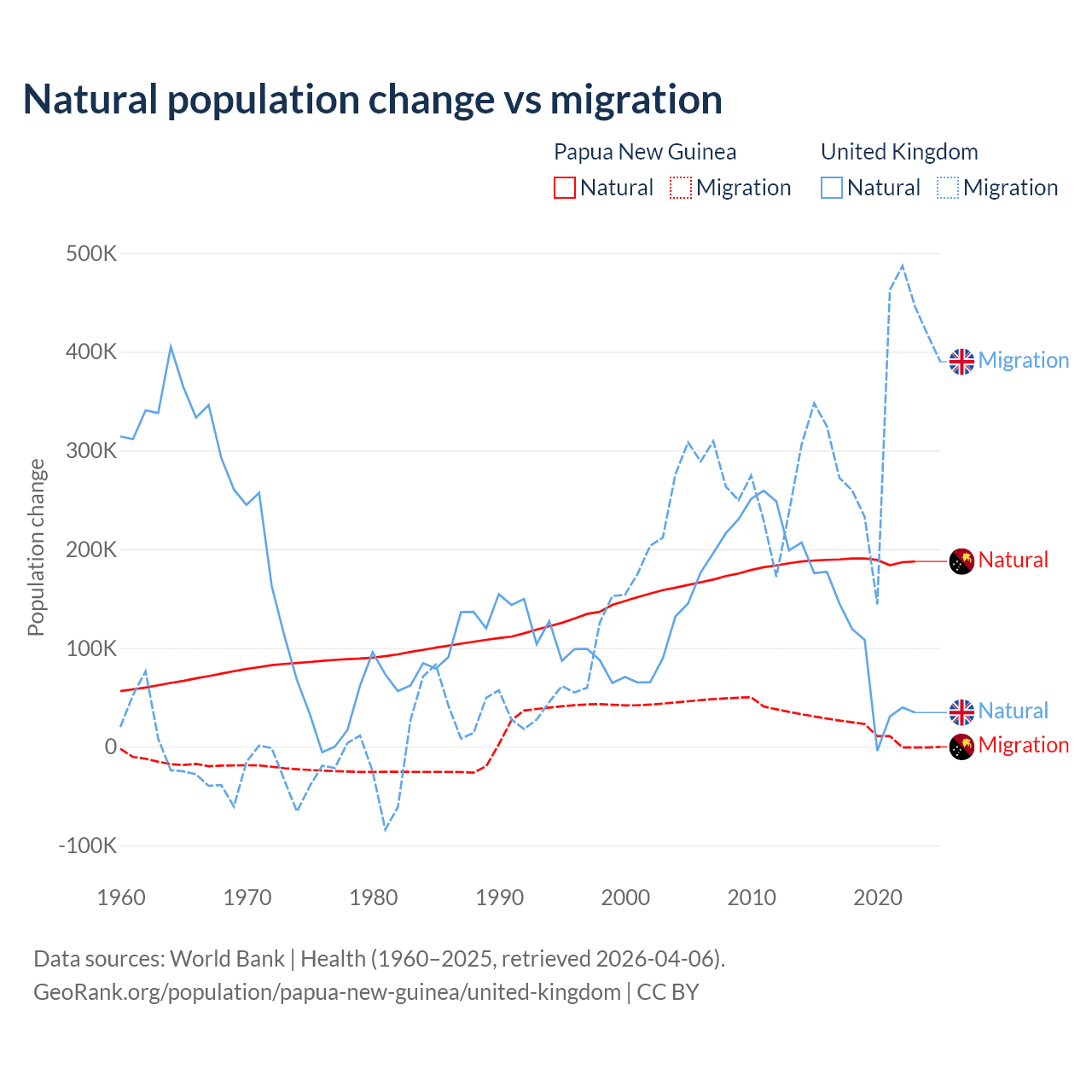 Over the last 10 years, 91% of the population change in Papua New Guinea is from natural causes (a gain of 1,883,906 people) and 8.98% is from migration (a gain of 185,900 people). In the United Kingdom 23.9% is from natural causes (a gain of 1,033,129 people) and 76.1% is from migration (a gain of 3,283,101 people).