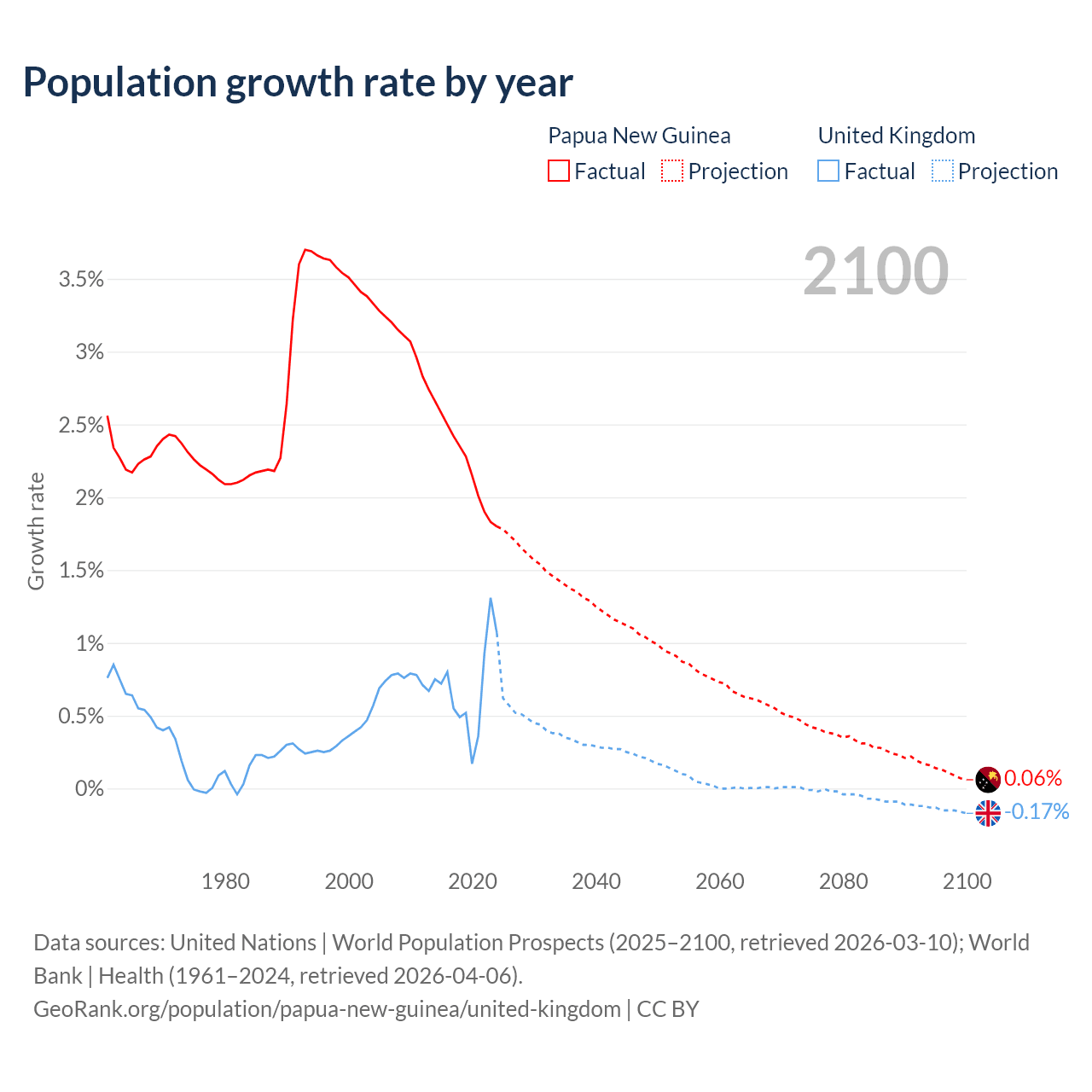 - For the last 10 years, Papua New Guinea has had an average growth rate of +2.23% per year vs +0.7% in the United Kingdom.