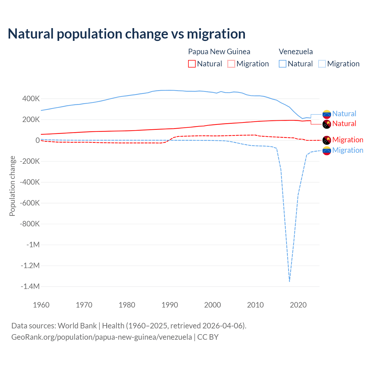 Over the last 10 years, 91% of the population change in Papua New Guinea is from natural causes (a gain of 1,883,906 people) and 8.98% is from migration (a gain of 185,900 people). In Venezuela 38.6% is from natural causes (a gain of 2,946,257 people) and 61.4% is from migration (a loss of 4,683,227 people).