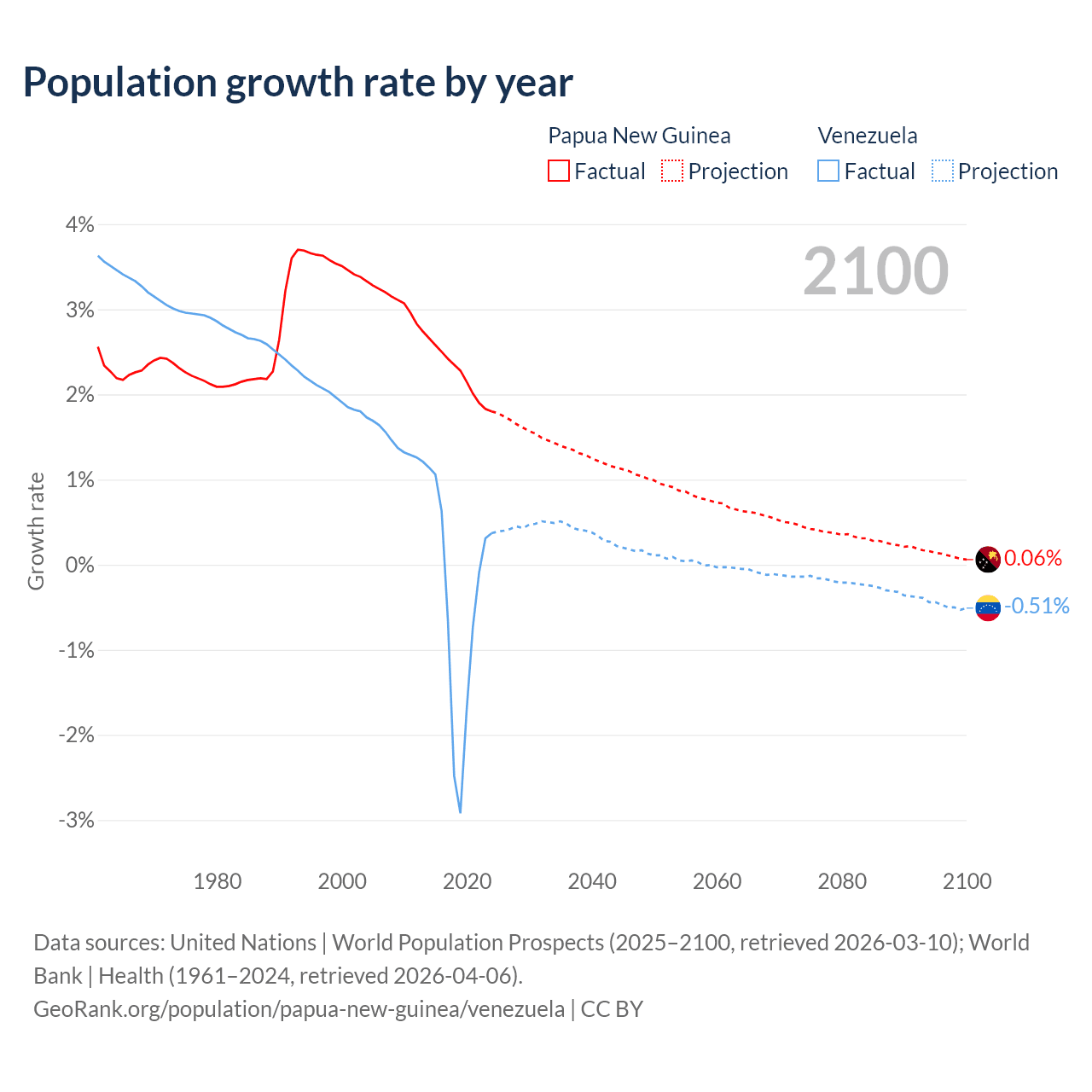 - For the last 10 years, Papua New Guinea has had an average growth rate of +2.23% per year vs -0.46% in Venezuela.