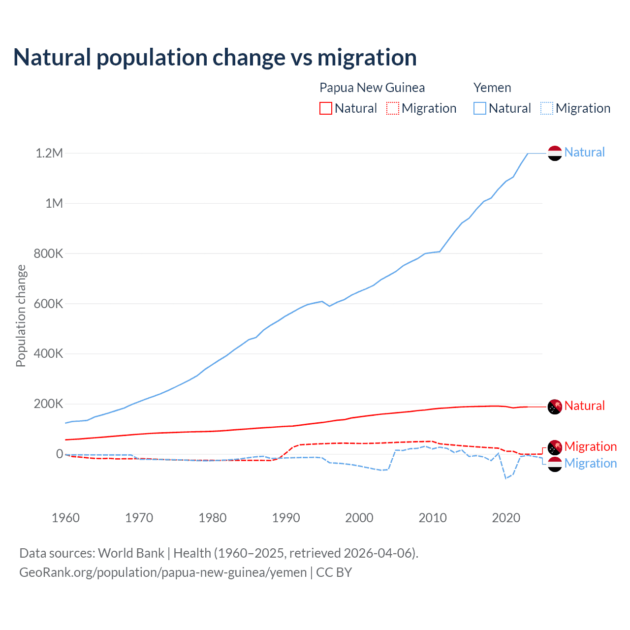 Over the last 10 years, 91% of the population change in Papua New Guinea is from natural causes (a gain of 1,883,906 people) and 8.98% is from migration (a gain of 185,900 people). In Yemen 97.8% is from natural causes (a gain of 10,460,813 people) and 2.17% is from migration (a loss of 231,814 people).