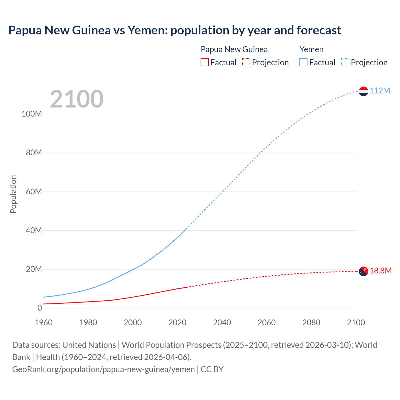 The latest officially reported population of Papua New Guinea was 10,576,502 in 2024 vs 40,583,164 people in Yemen in 2024. In 2026, based on the adjusted UN estimation, the current Papua New Guinea's population is 11,002,753 people compared to 43,325,643 in Yemen.