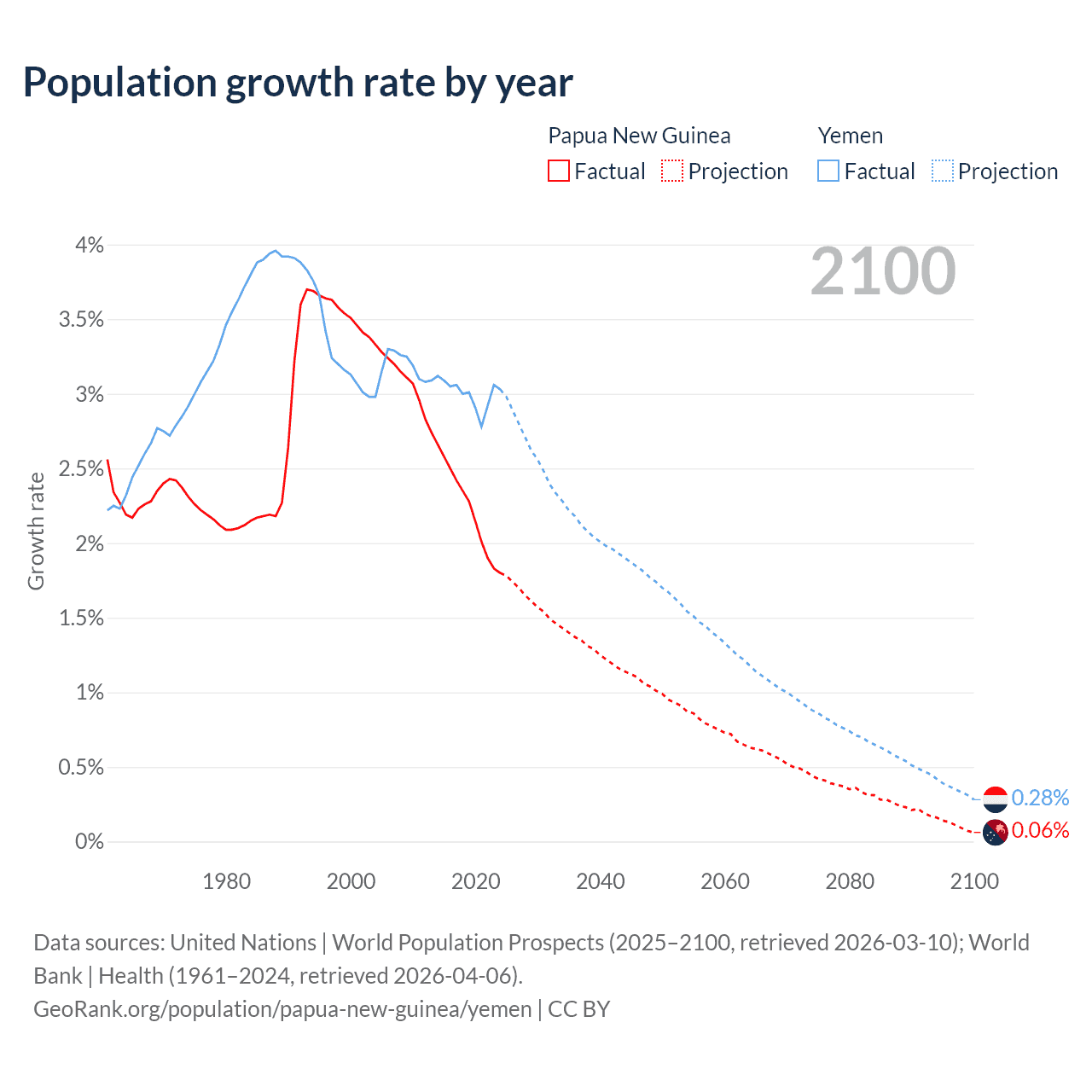 - For the last 10 years, Papua New Guinea has had an average growth rate of +2.23% per year vs +3% in Yemen.