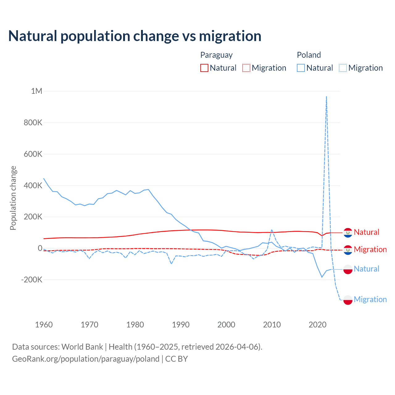 Over the last 10 years, 87.6% of the population change in Paraguay is from natural causes (a gain of 1,002,636 people) and 12.4% is from migration (a loss of 141,377 people). In Poland 41.4% is from natural causes (a loss of 675,443 people) and 58.6% is from migration (a gain of 955,766 people).