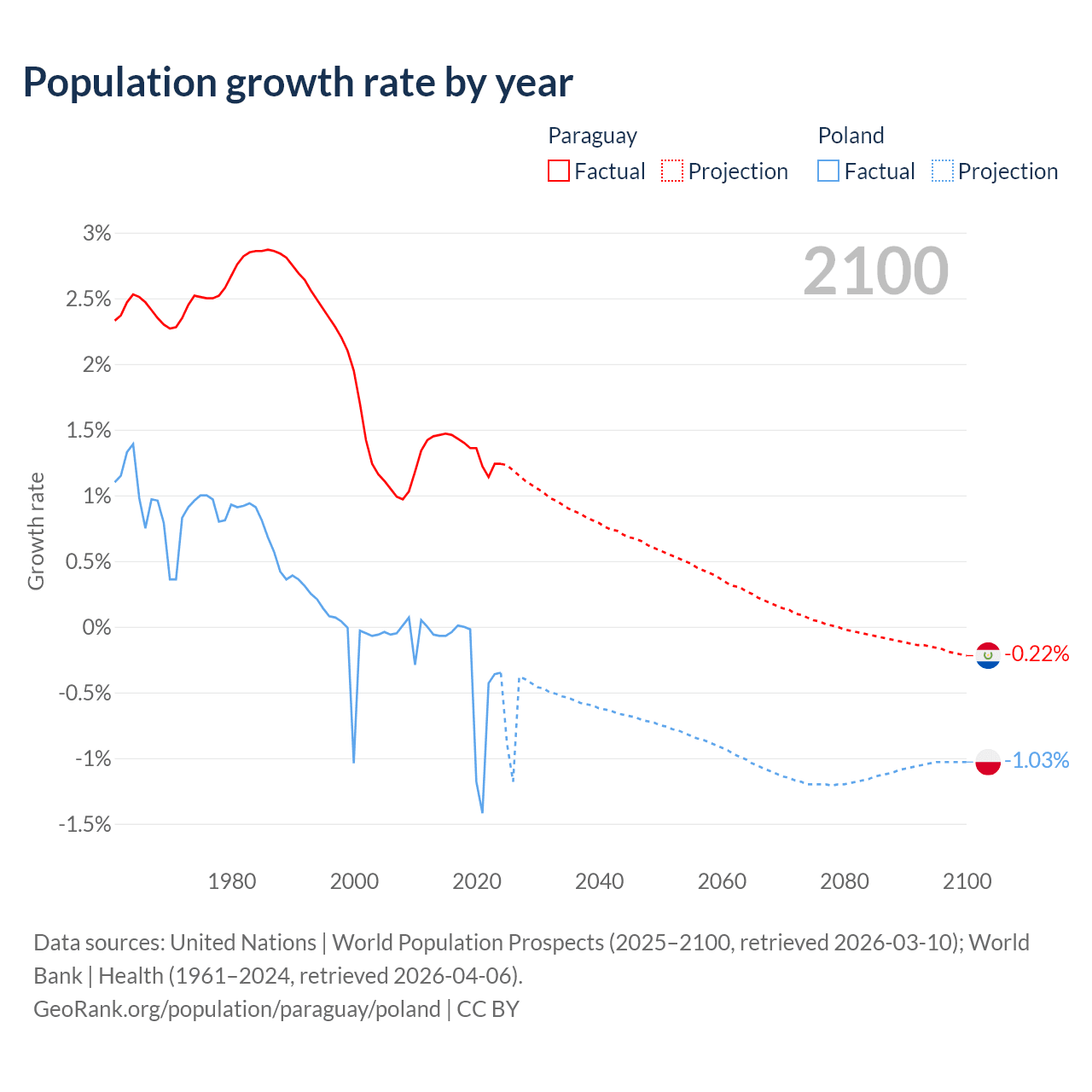 - For the last 10 years, Paraguay has had an average growth rate of +1.34% per year vs -0.36% in Poland.