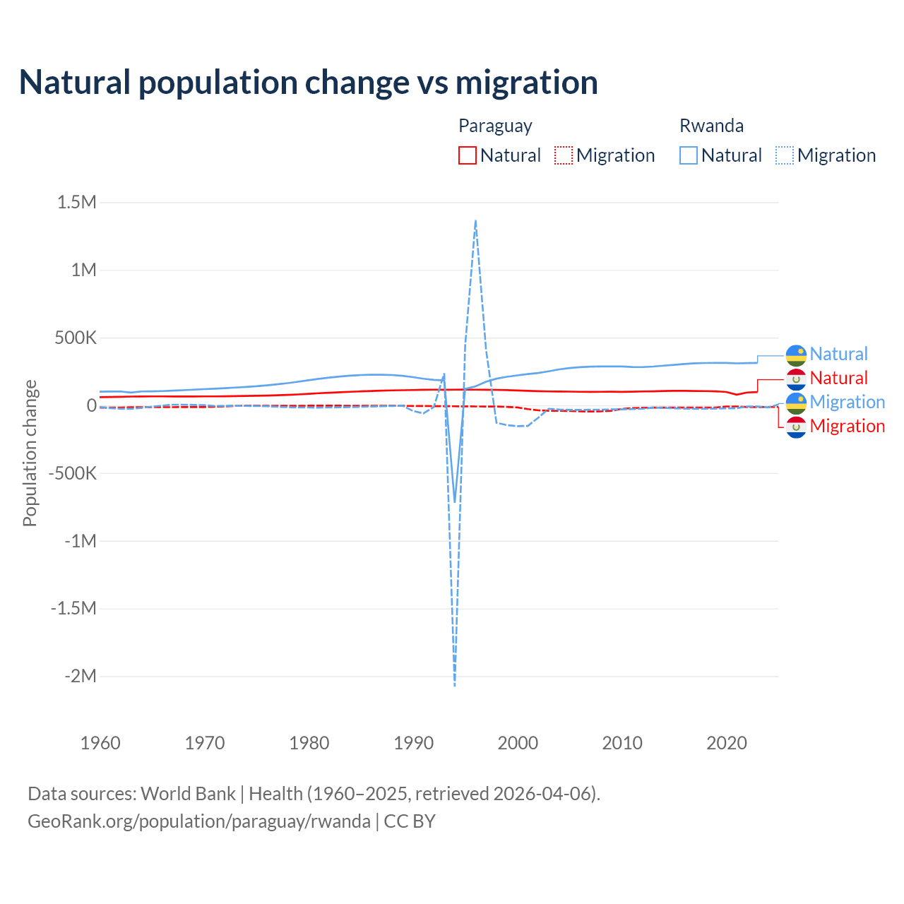 Over the last 10 years, 87.6% of the population change in Paraguay is from natural causes (a gain of 1,002,636 people) and 12.4% is from migration (a loss of 141,377 people). In Rwanda 93.8% is from natural causes (a gain of 3,081,296 people) and 6.18% is from migration (a loss of 203,035 people).