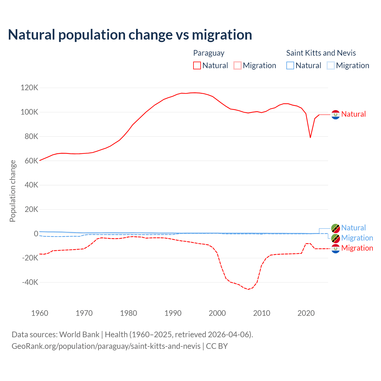 Over the last 10 years, 87.6% of the population change in Paraguay is from natural causes (a gain of 1,002,636 people) and 12.4% is from migration (a loss of 141,377 people). In Saint Kitts and Nevis 44.9% is from natural causes (a gain of 1,225 people) and 55.1% is from migration (a loss of 1,506 people).