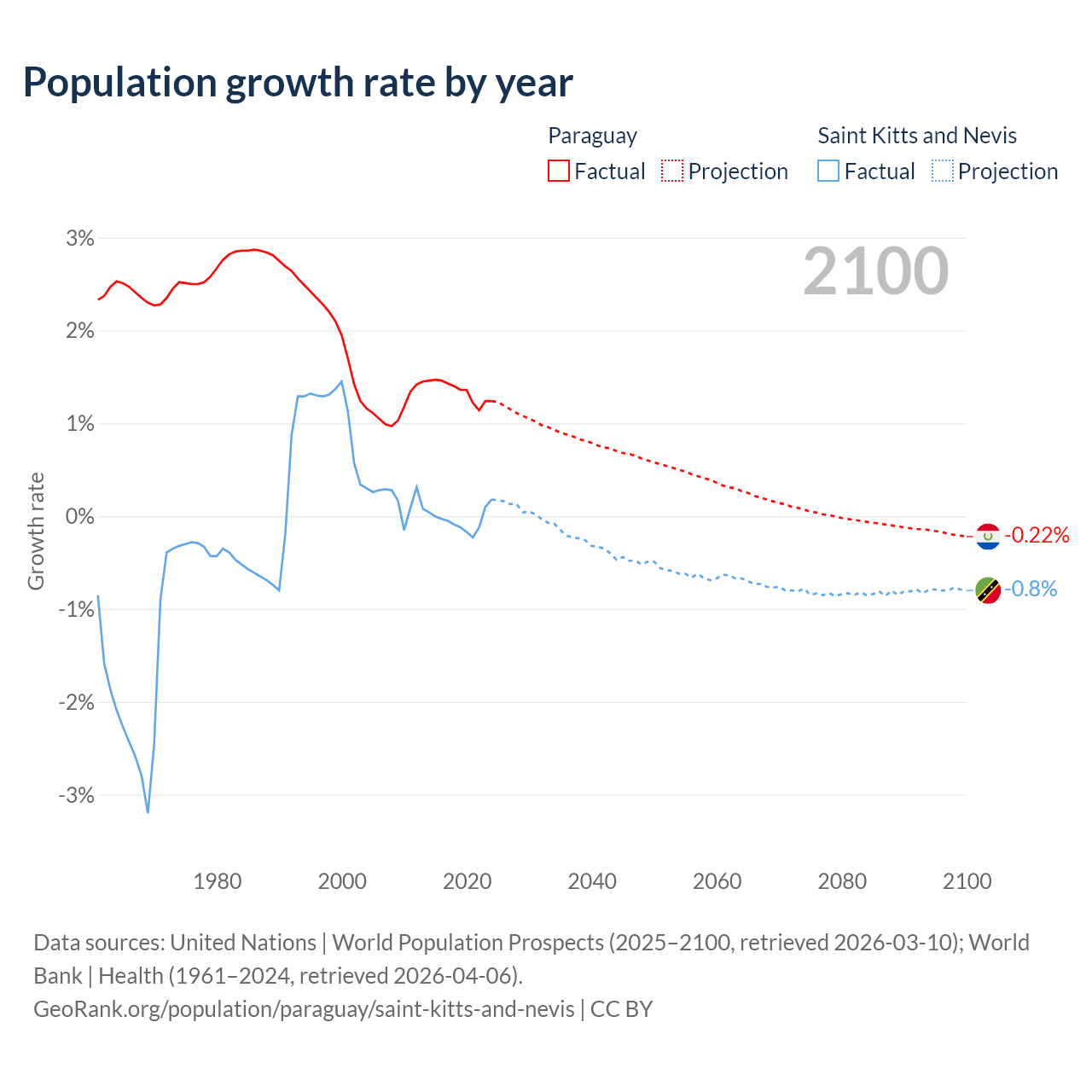 - For the last 10 years, Paraguay has had an average growth rate of +1.34% per year vs -0.04% in Saint Kitts and Nevis.