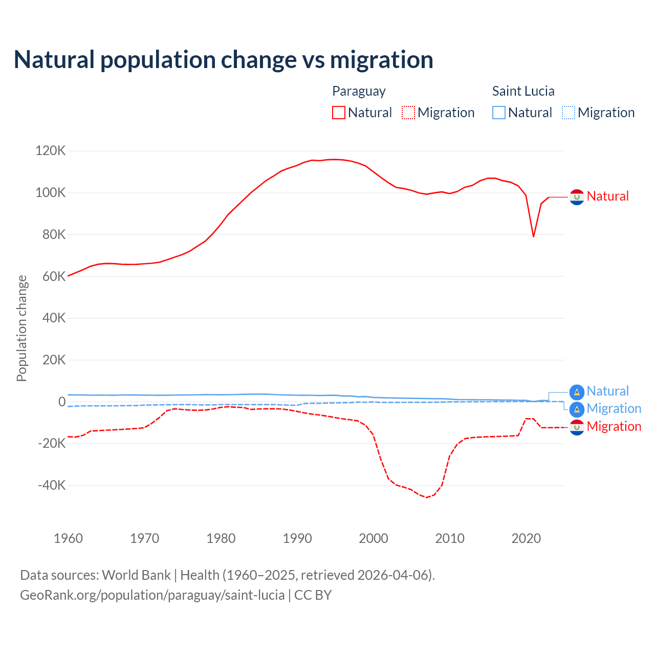 Over the last 10 years, 87.6% of the population change in Paraguay is from natural causes (a gain of 1,002,636 people) and 12.4% is from migration (a loss of 141,377 people). In Saint Lucia 95.7% is from natural causes (a gain of 6,039 people) and 4.31% is from migration (a loss of 272 people).