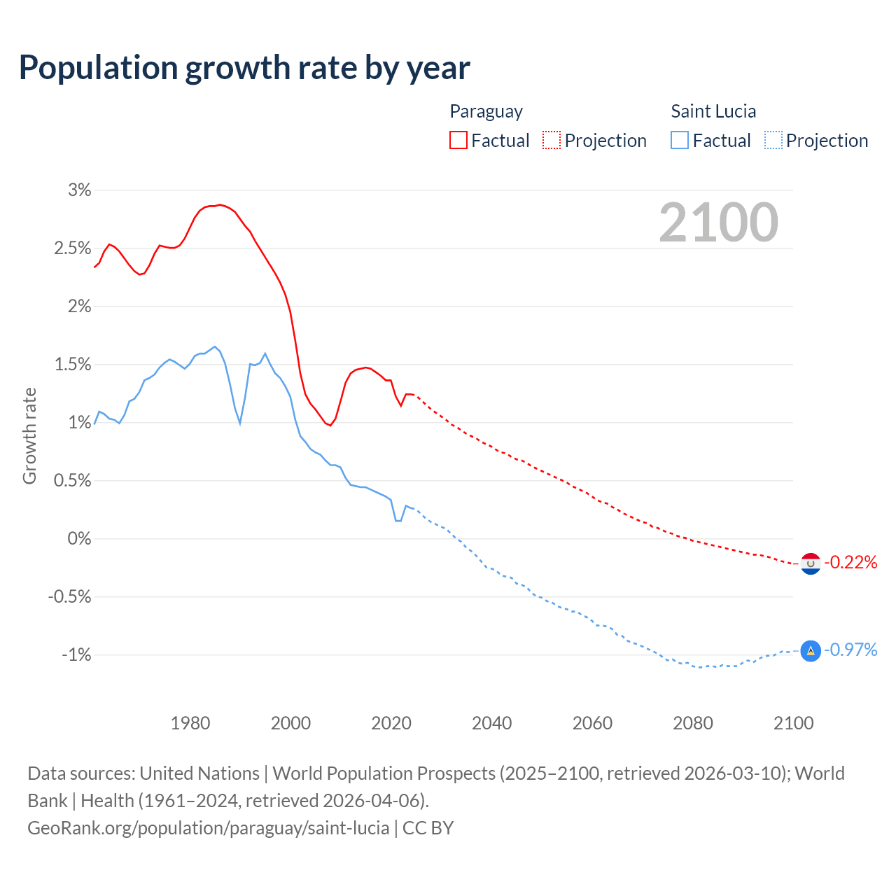 - For the last 10 years, Paraguay has had an average growth rate of +1.34% per year vs +0.33% in Saint Lucia.