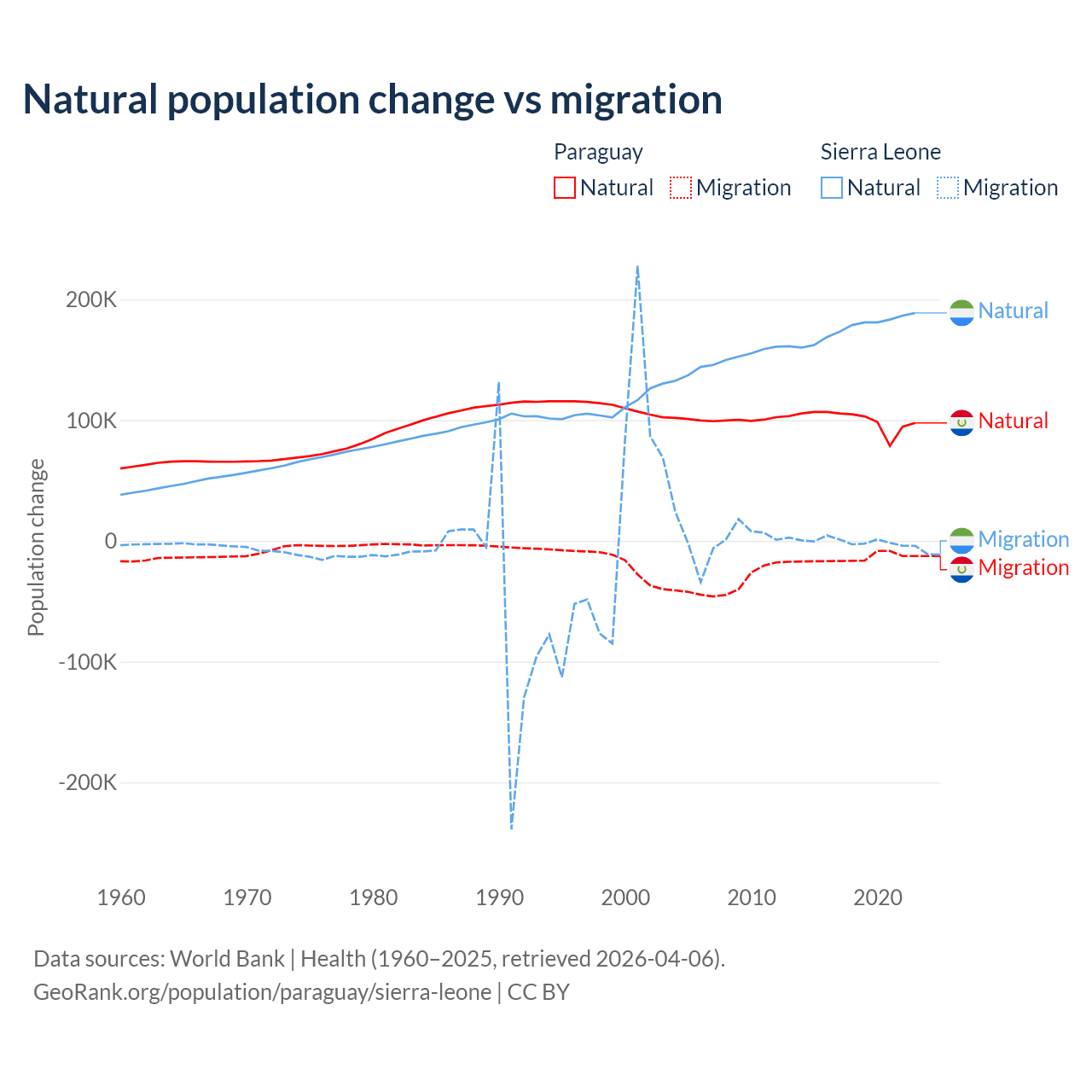 Over the last 10 years, 87.6% of the population change in Paraguay is from natural causes (a gain of 1,002,636 people) and 12.4% is from migration (a loss of 141,377 people). In Sierra Leone 99.6% is from natural causes (a gain of 1,764,049 people) and 0.41% is from migration (a loss of 7,211 people).