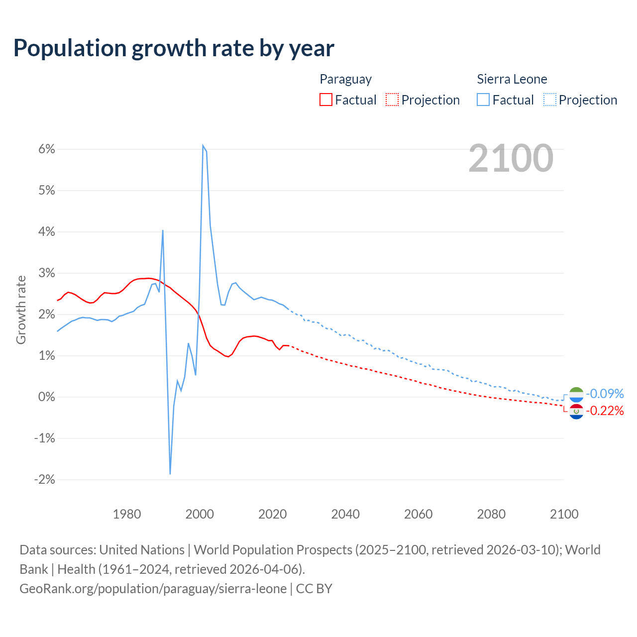 - For the last 10 years, Paraguay has had an average growth rate of +1.34% per year vs +2.32% in Sierra Leone.