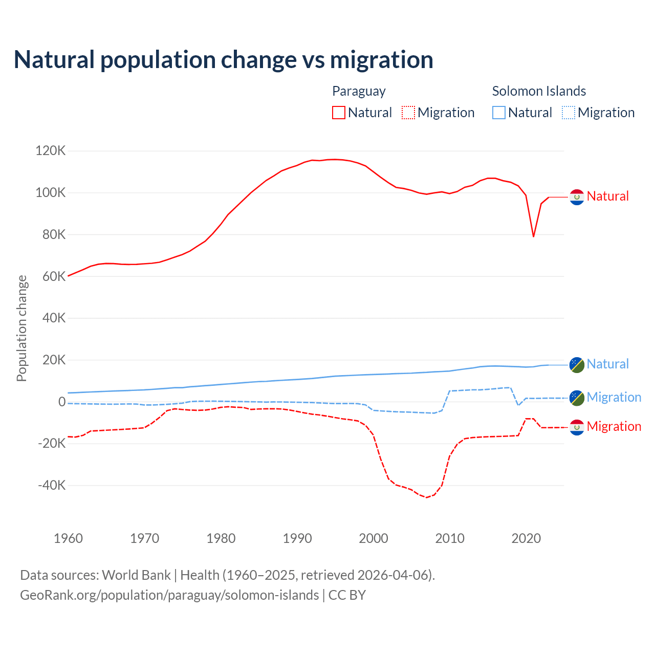 Over the last 10 years, 87.6% of the population change in Paraguay is from natural causes (a gain of 1,002,636 people) and 12.4% is from migration (a loss of 141,377 people). In the Solomon Islands 82.8% is from natural causes (a gain of 168,727 people) and 17.2% is from migration (a gain of 35,031 people).