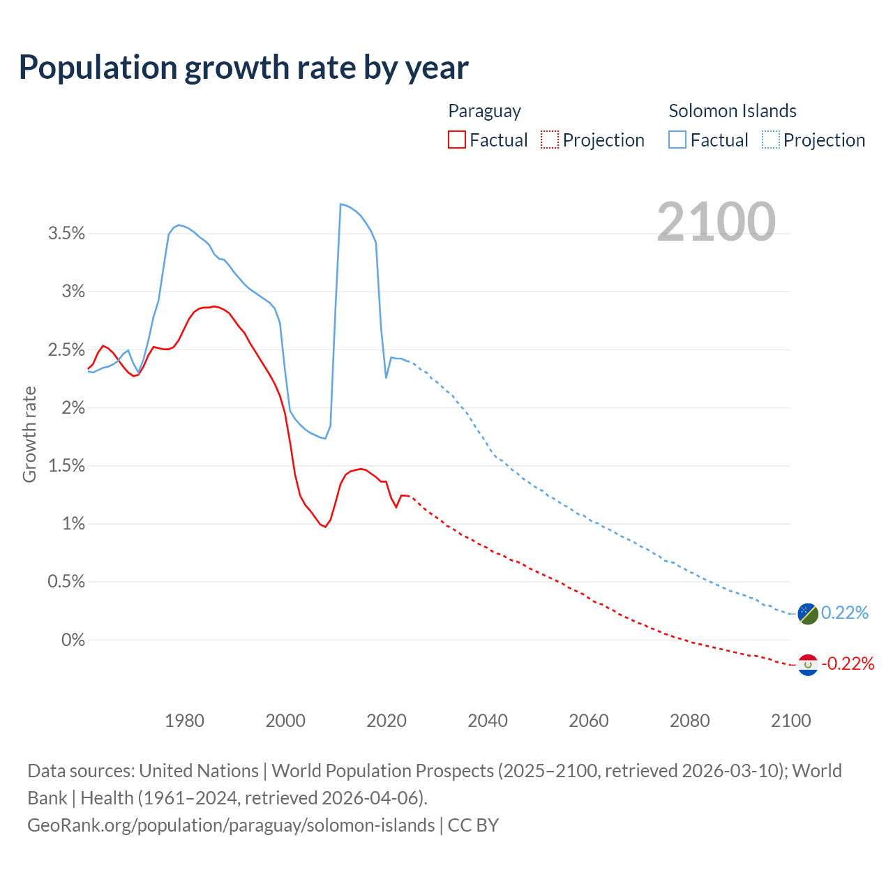 - For the last 10 years, Paraguay has had an average growth rate of +1.34% per year vs +2.95% in the Solomon Islands.