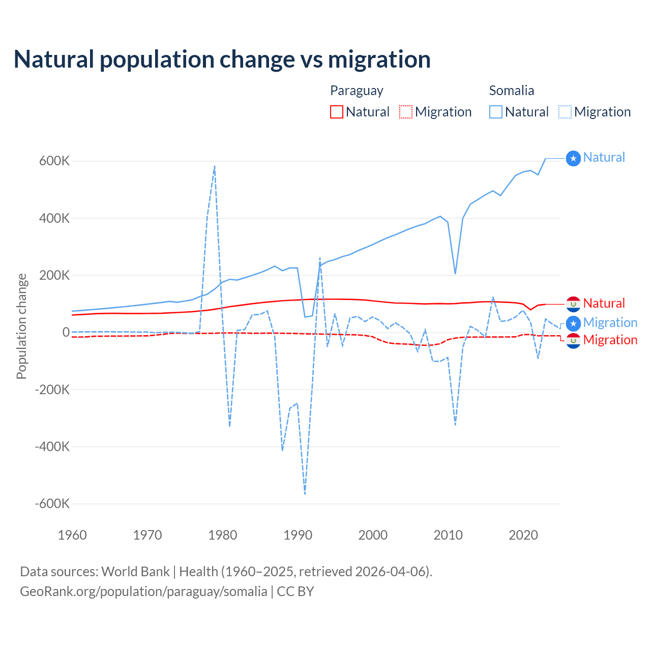 Over the last 10 years, 87.6% of the population change in Paraguay is from natural causes (a gain of 1,002,636 people) and 12.4% is from migration (a loss of 141,377 people). In Somalia 94.4% is from natural causes (a gain of 5,270,105 people) and 5.58% is from migration (a gain of 311,487 people).