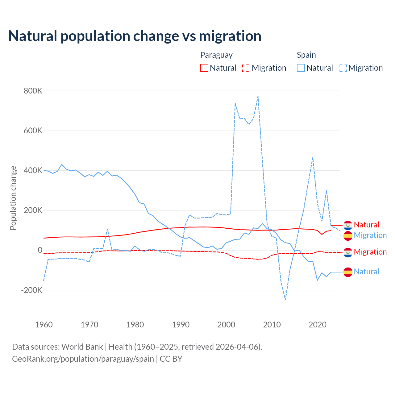 Over the last 10 years, 87.6% of the population change in Paraguay is from natural causes (a gain of 1,002,636 people) and 12.4% is from migration (a loss of 141,377 people). In Spain 25.8% is from natural causes (a loss of 627,829 people) and 74.2% is from migration (a gain of 1,810,127 people).