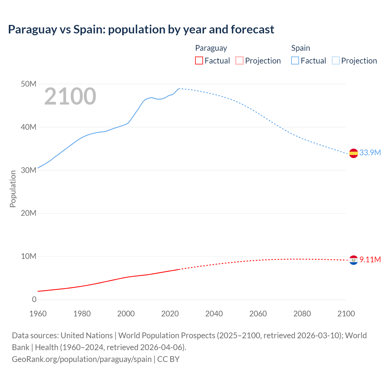 Paraguay vs Spain: population by year and forecast