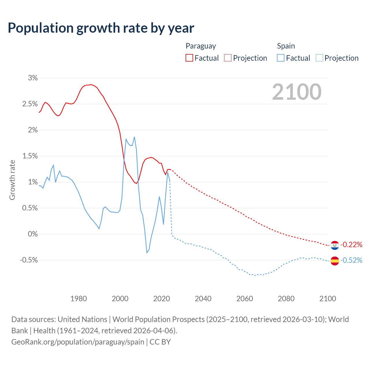 - For the last 10 years, Paraguay has had an average growth rate of +1.34% per year vs +0.43% in Spain.