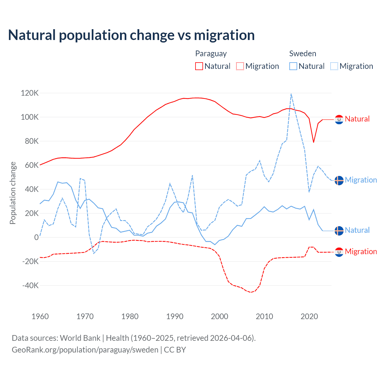 Over the last 10 years, 87.6% of the population change in Paraguay is from natural causes (a gain of 1,002,636 people) and 12.4% is from migration (a loss of 141,377 people). In Sweden 21.4% is from natural causes (a gain of 201,900 people) and 78.6% is from migration (a gain of 743,642 people).