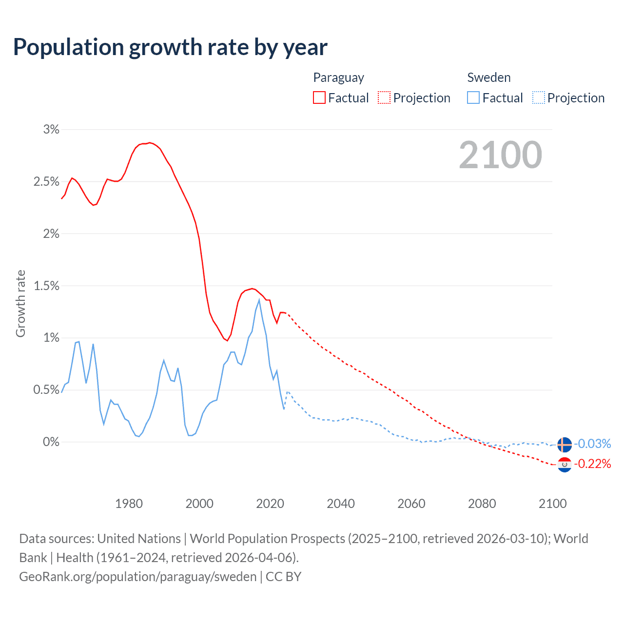 - For the last 10 years, Paraguay has had an average growth rate of +1.34% per year vs +0.88% in Sweden.