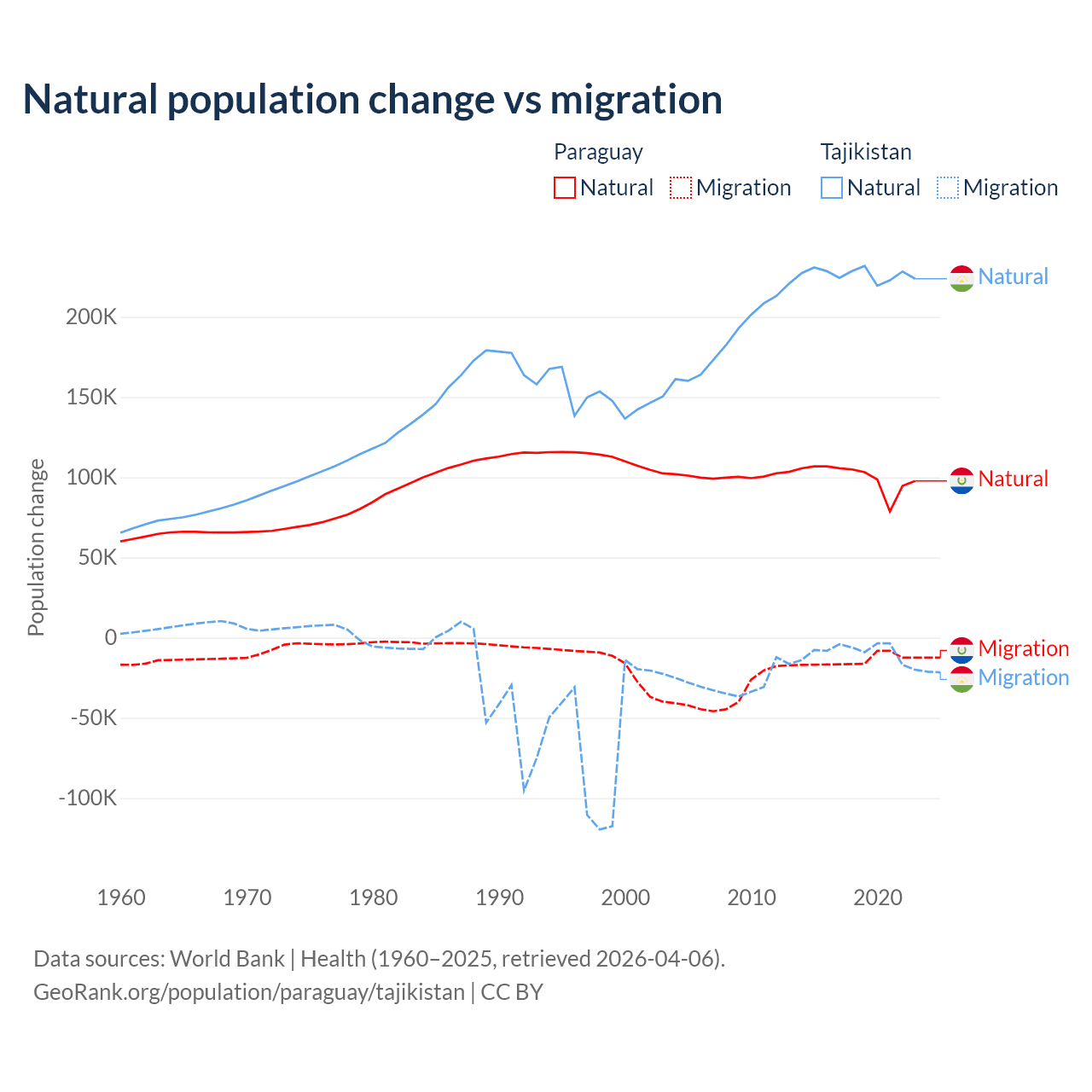 Over the last 10 years, 87.6% of the population change in Paraguay is from natural causes (a gain of 1,002,636 people) and 12.4% is from migration (a loss of 141,377 people). In Tajikistan 96% is from natural causes (a gain of 2,266,045 people) and 3.95% is from migration (a loss of 93,205 people).