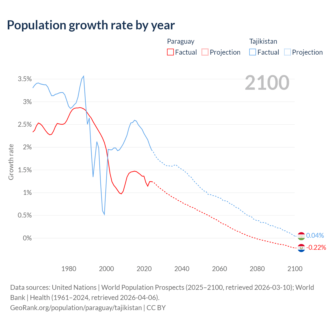 - For the last 10 years, Paraguay has had an average growth rate of +1.34% per year vs +2.33% in Tajikistan.