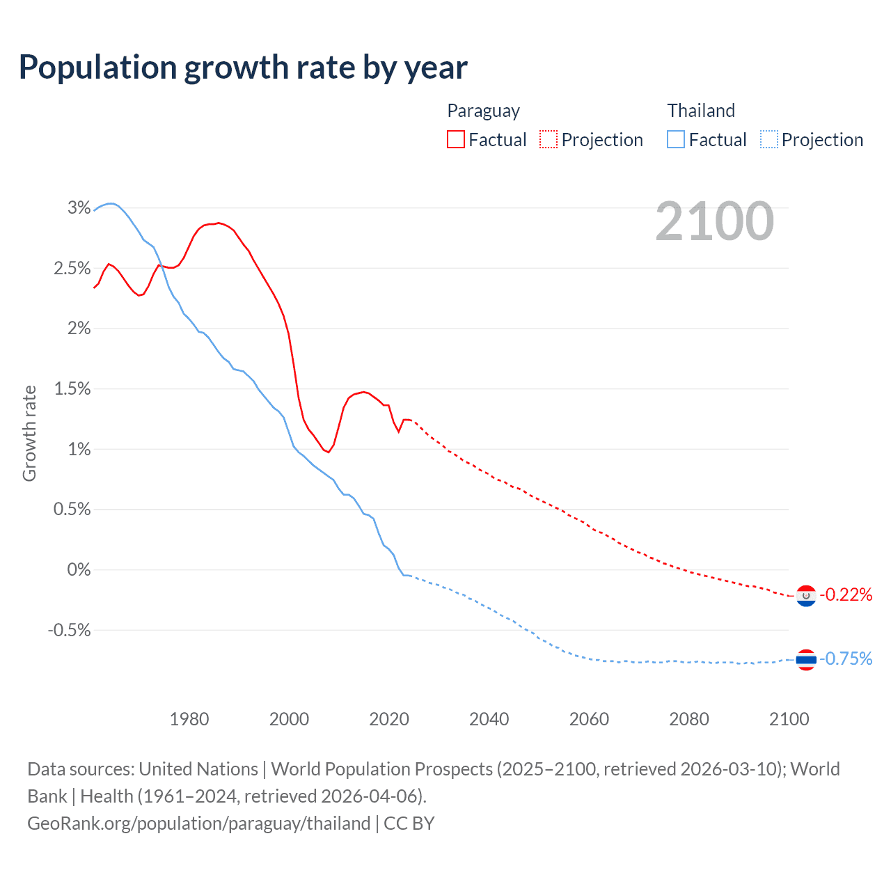 - For the last 10 years, Paraguay has had an average growth rate of +1.34% per year vs +0.23% in Thailand.