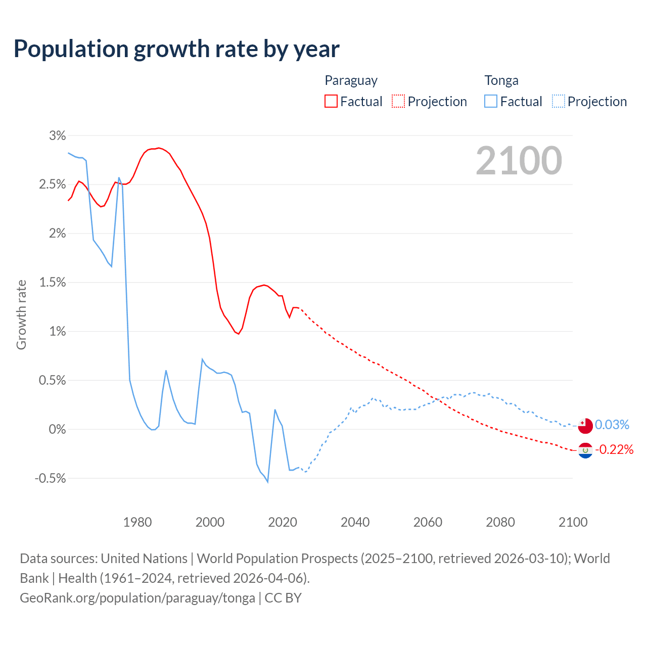 - For the last 10 years, Paraguay has had an average growth rate of +1.34% per year vs -0.25% in Tonga.