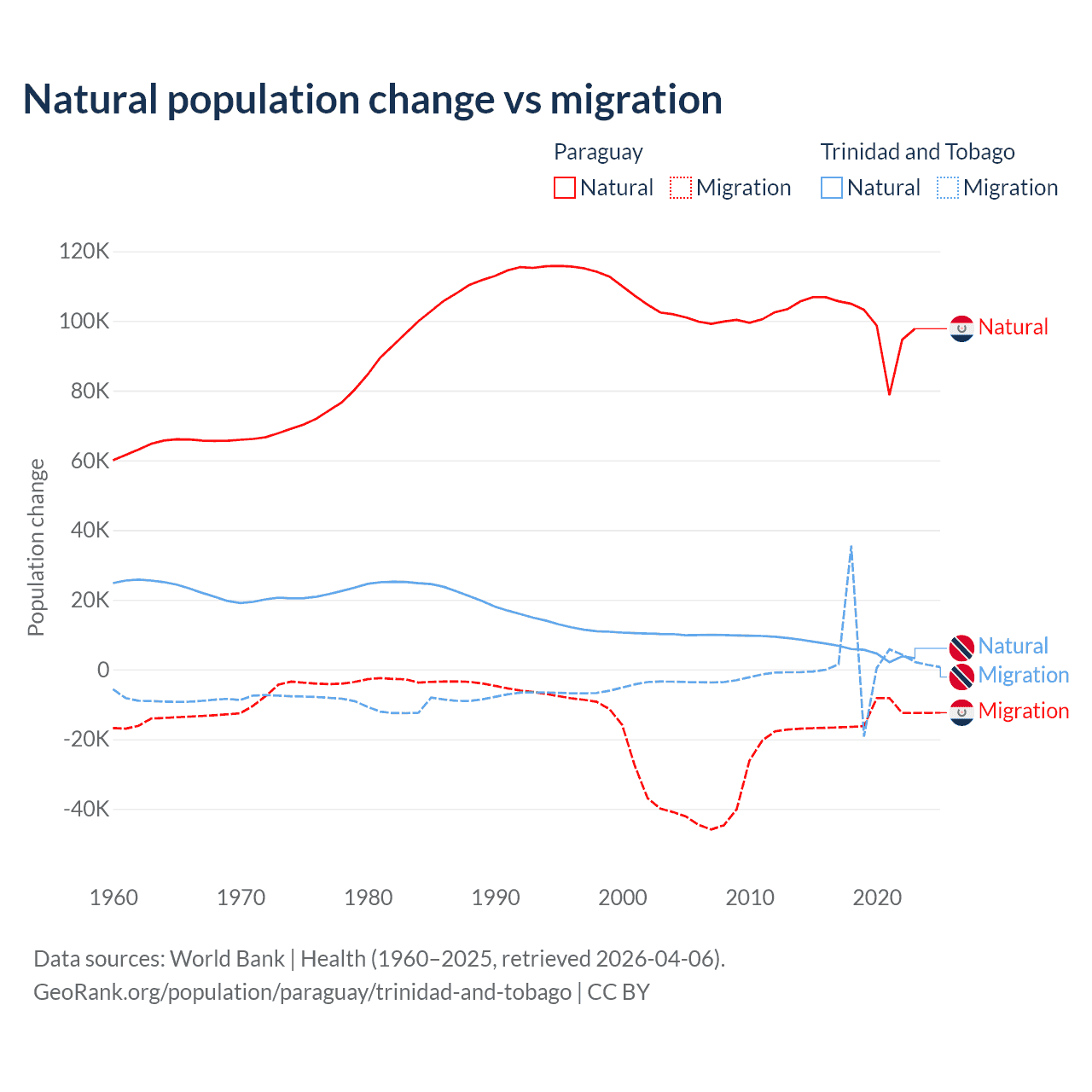 Over the last 10 years, 87.6% of the population change in Paraguay is from natural causes (a gain of 1,002,636 people) and 12.4% is from migration (a loss of 141,377 people). In Trinidad and Tobago 66% is from natural causes (a gain of 55,887 people) and 34% is from migration (a gain of 28,785 people).
