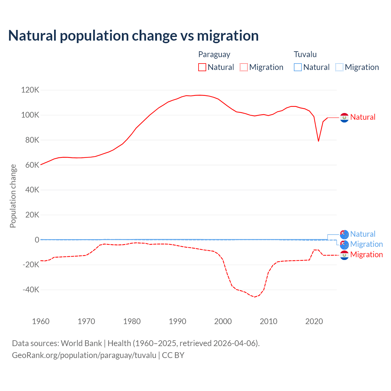 Over the last 10 years, 87.6% of the population change in Paraguay is from natural causes (a gain of 1,002,636 people) and 12.4% is from migration (a loss of 141,377 people). In Tuvalu 35.5% is from natural causes (a gain of 1,556 people) and 64.5% is from migration (a loss of 2,827 people).