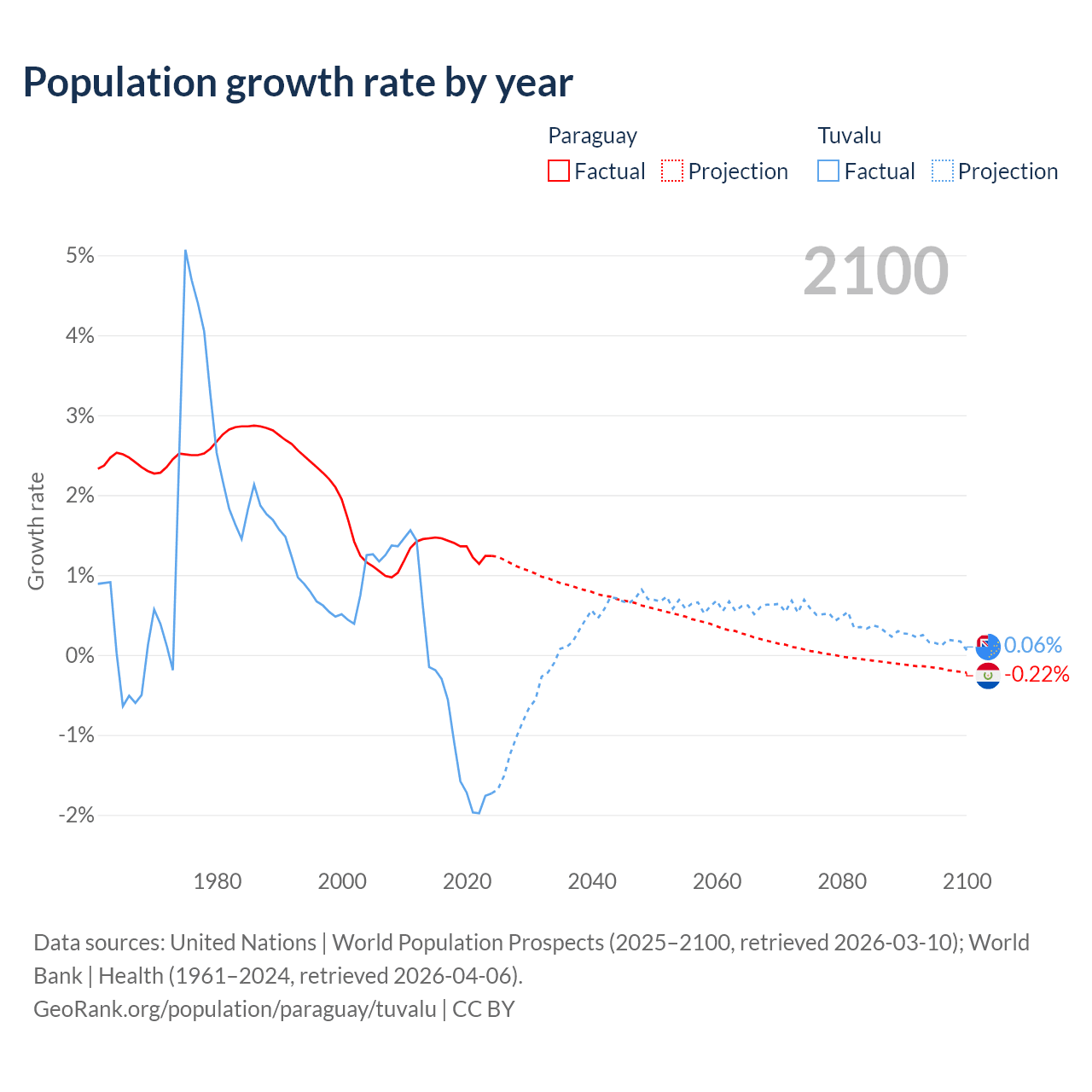 - For the last 10 years, Paraguay has had an average growth rate of +1.34% per year vs -1.19% in Tuvalu.