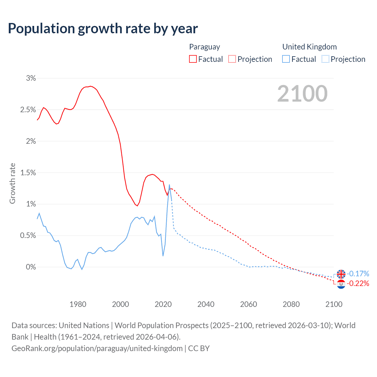 - For the last 10 years, Paraguay has had an average growth rate of +1.34% per year vs +0.7% in the United Kingdom.