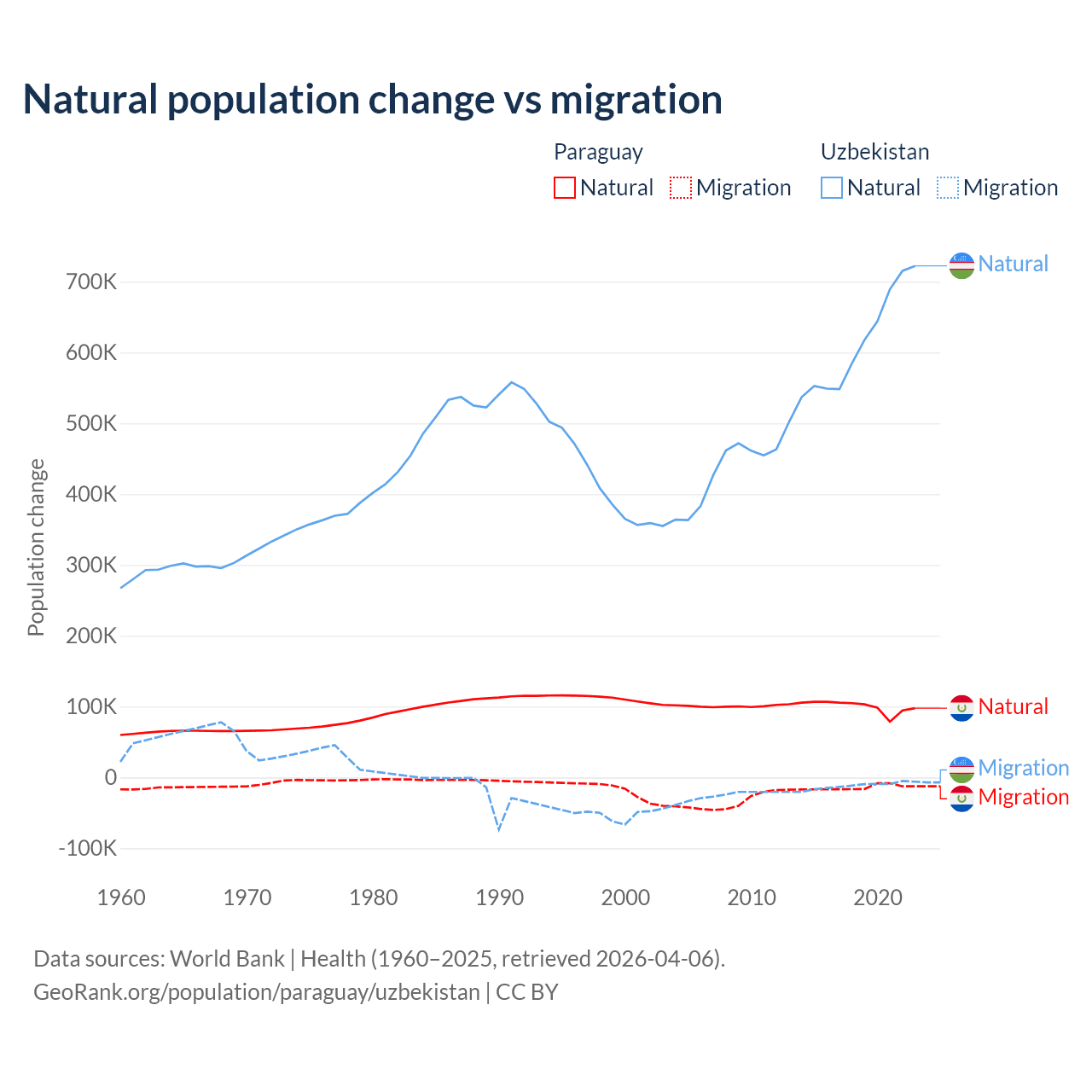 Over the last 10 years, 87.6% of the population change in Paraguay is from natural causes (a gain of 1,002,636 people) and 12.4% is from migration (a loss of 141,377 people). In Uzbekistan 98.2% is from natural causes (a gain of 6,161,117 people) and 1.84% is from migration (a loss of 115,398 people).