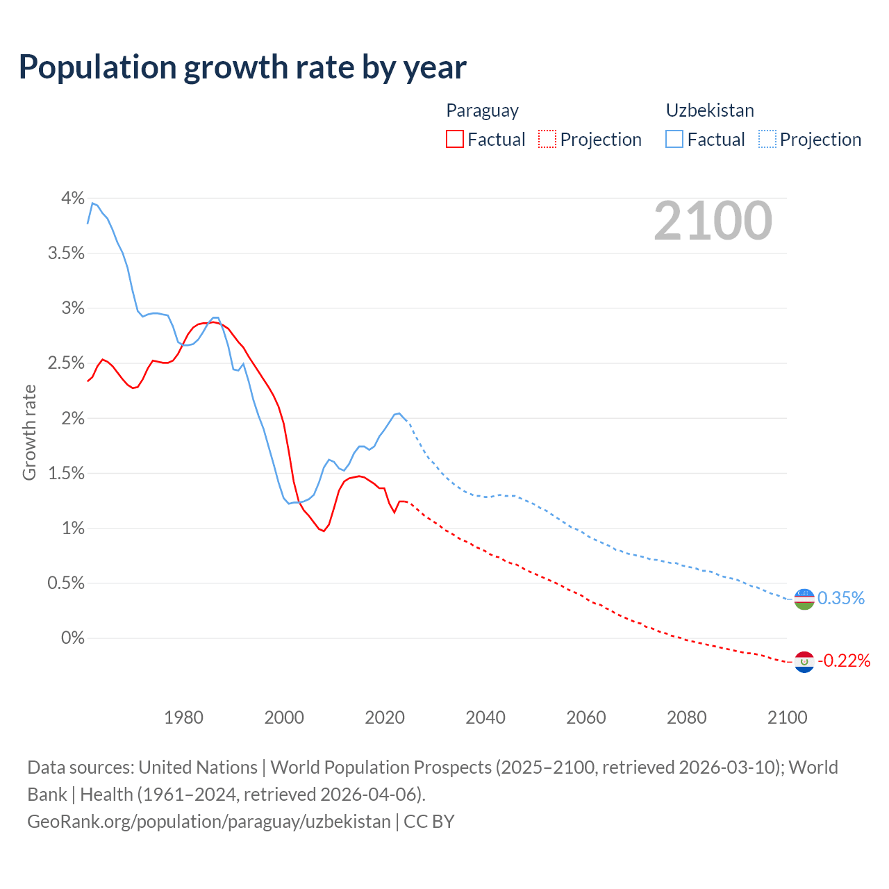 - For the last 10 years, Paraguay has had an average growth rate of +1.34% per year vs +1.85% in Uzbekistan.